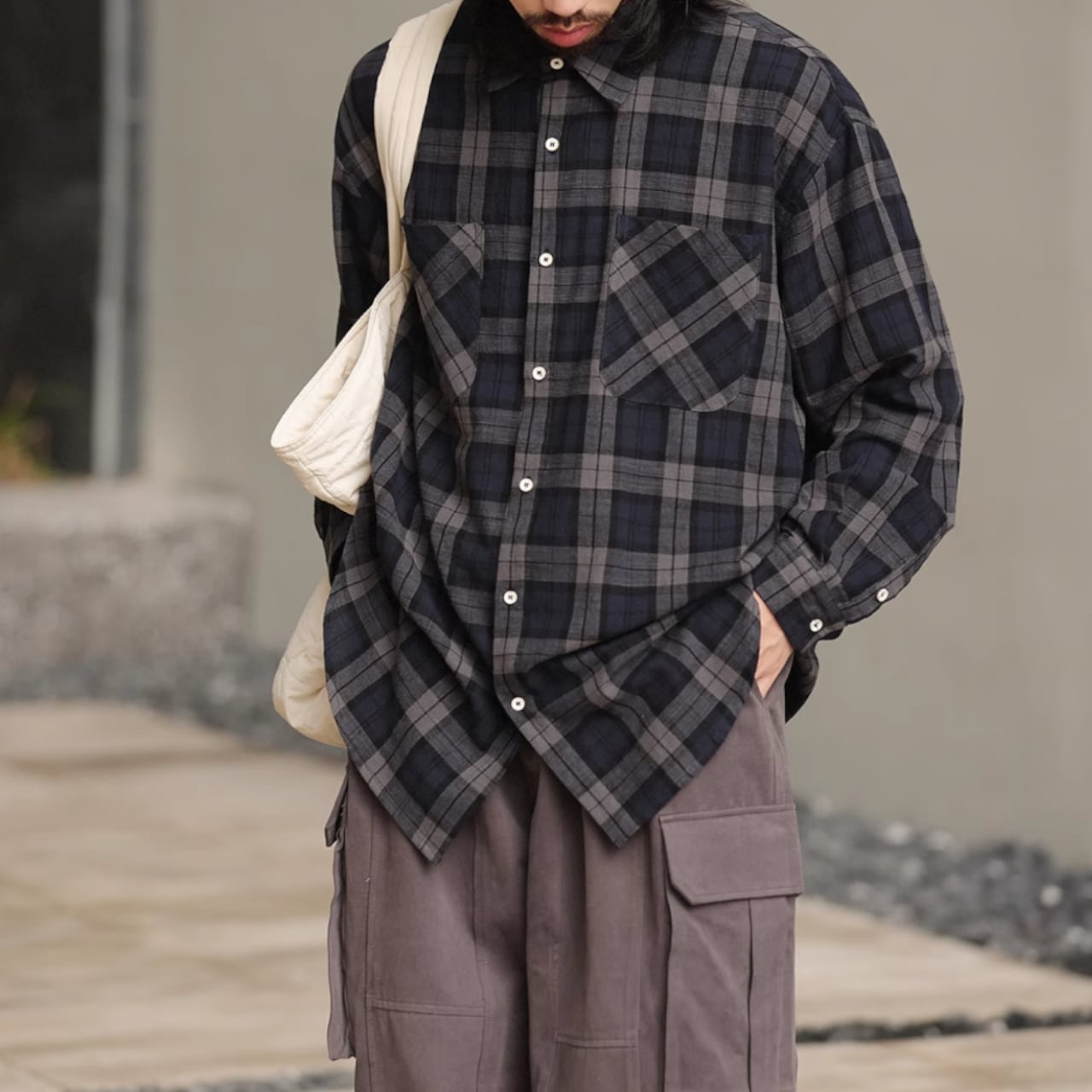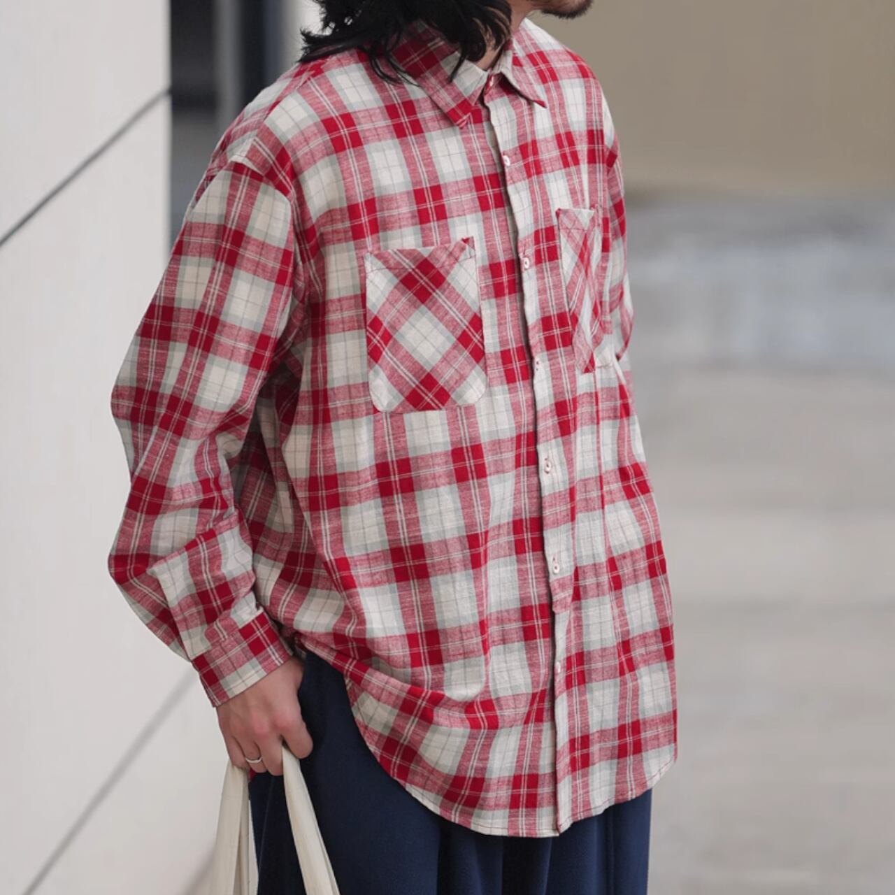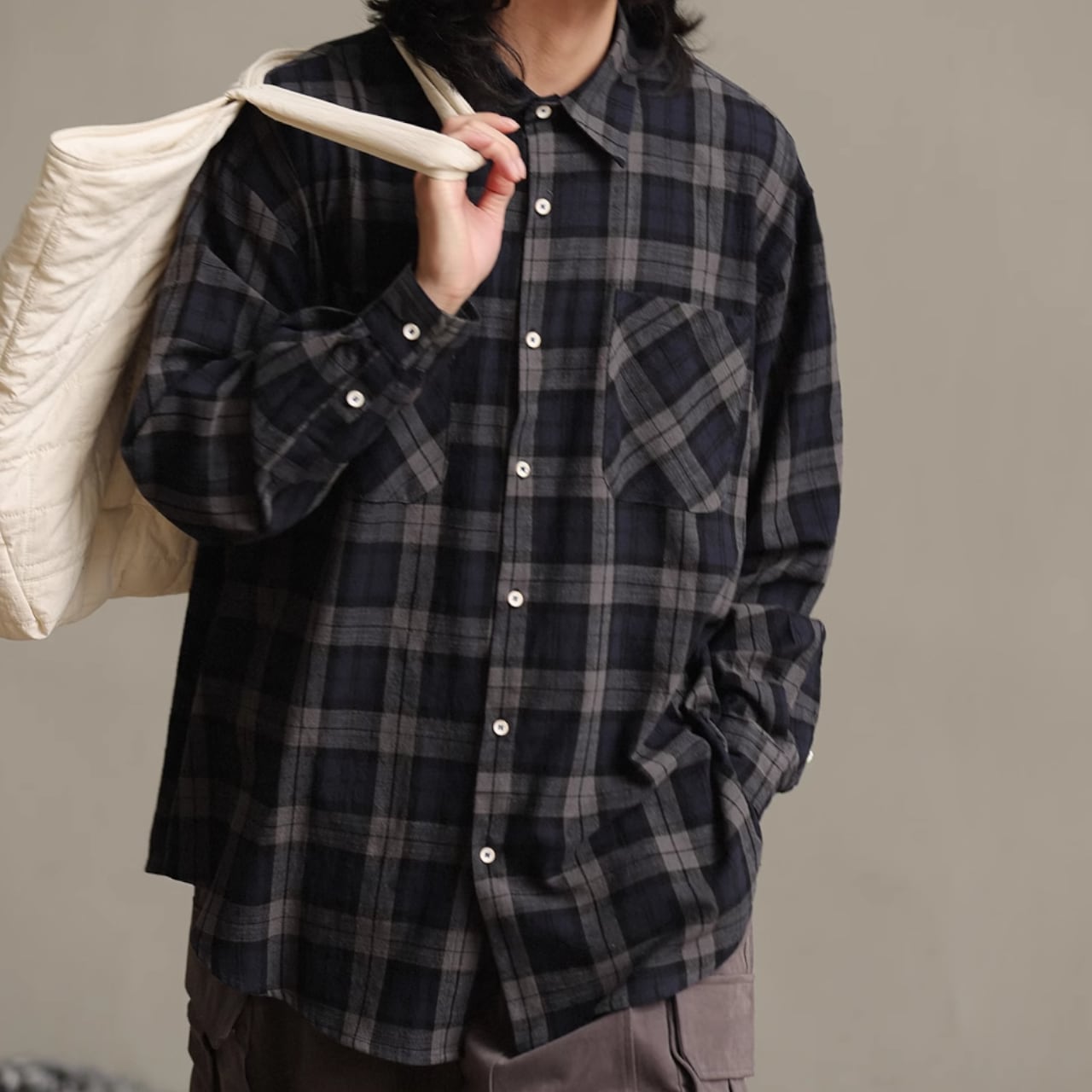コットンチェック柄の長袖ルーズシャツです。