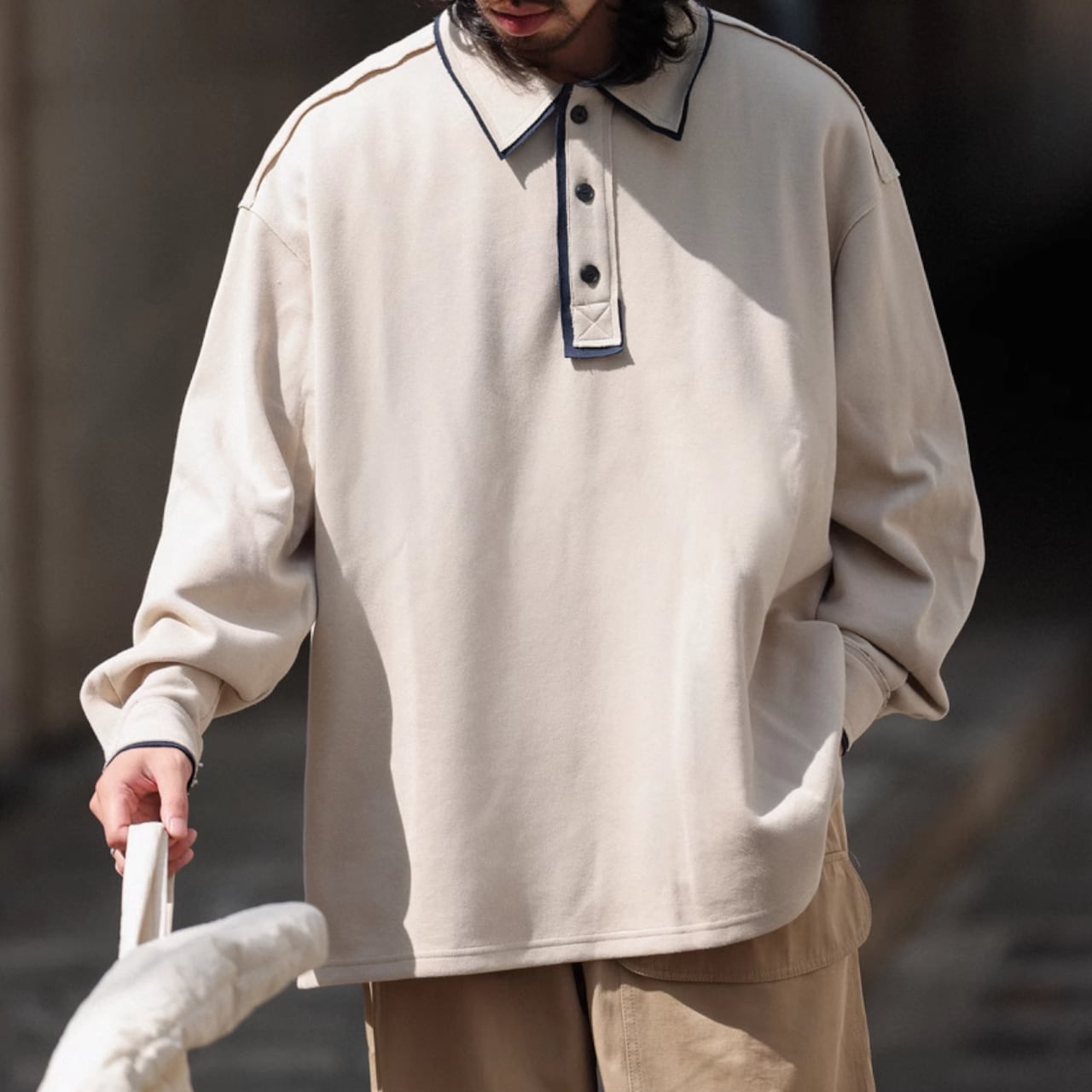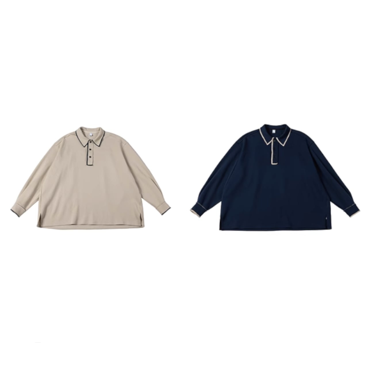 このスウェットシャツは、ネイビーブルーとアイボリーの2色展開で、