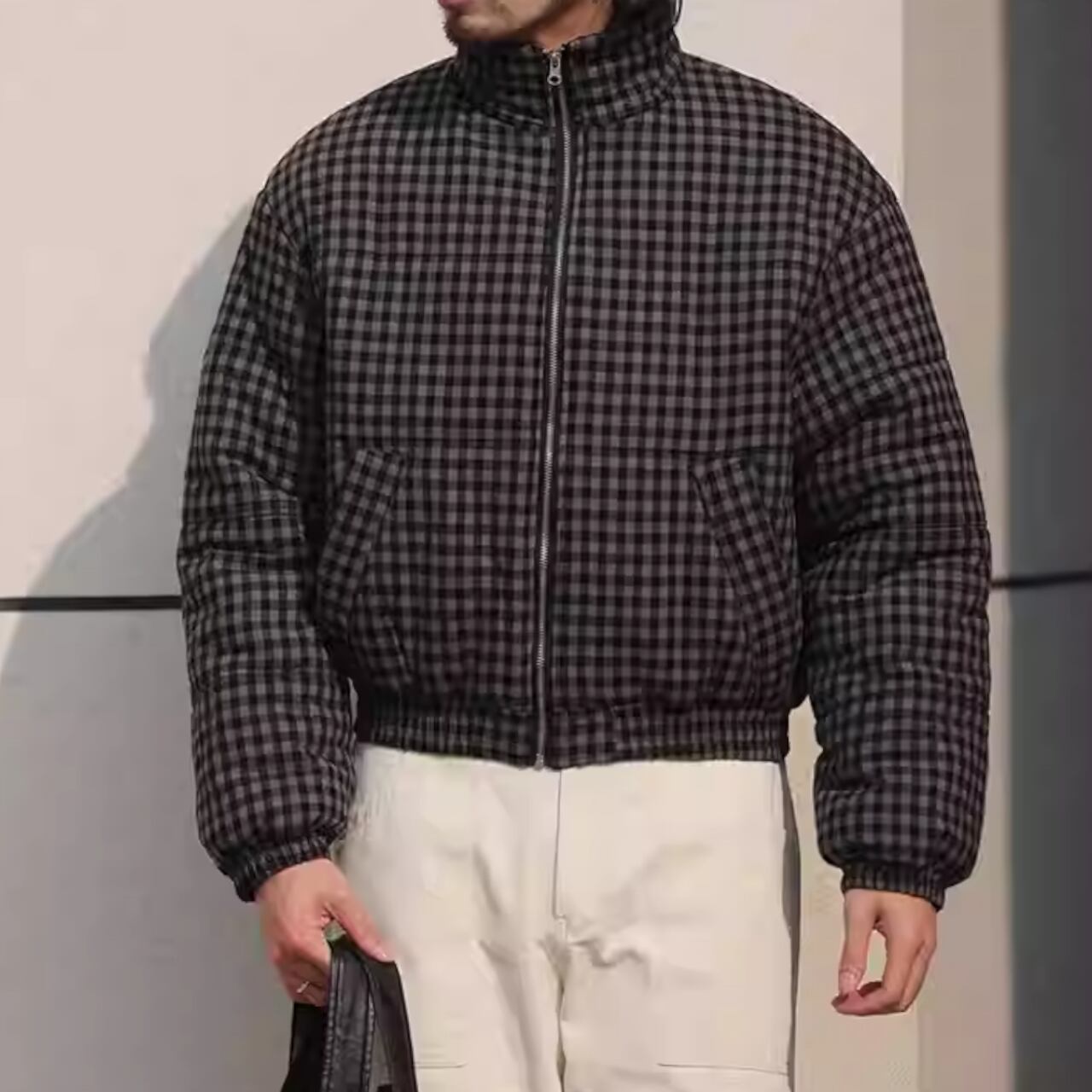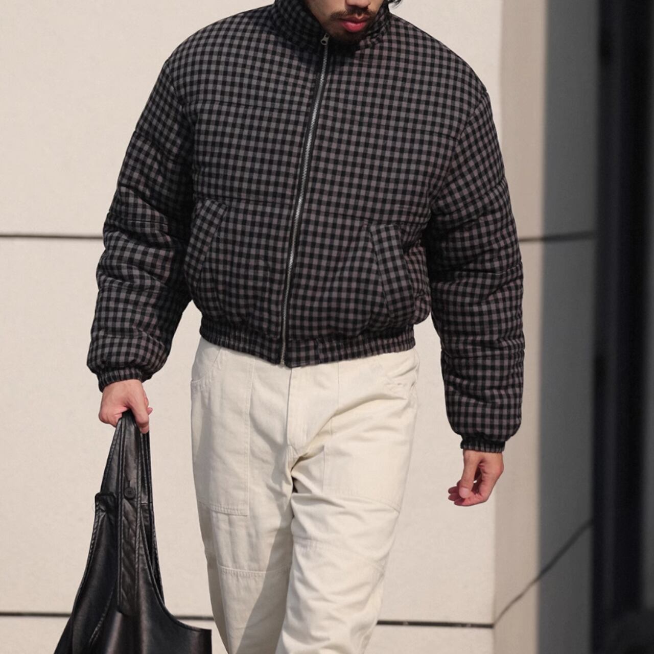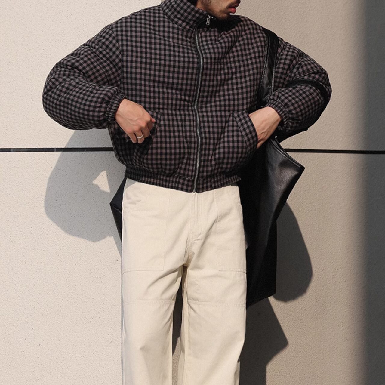 このジャケットは、チェック柄とルーズドロップショルダーのデザインが特徴で、